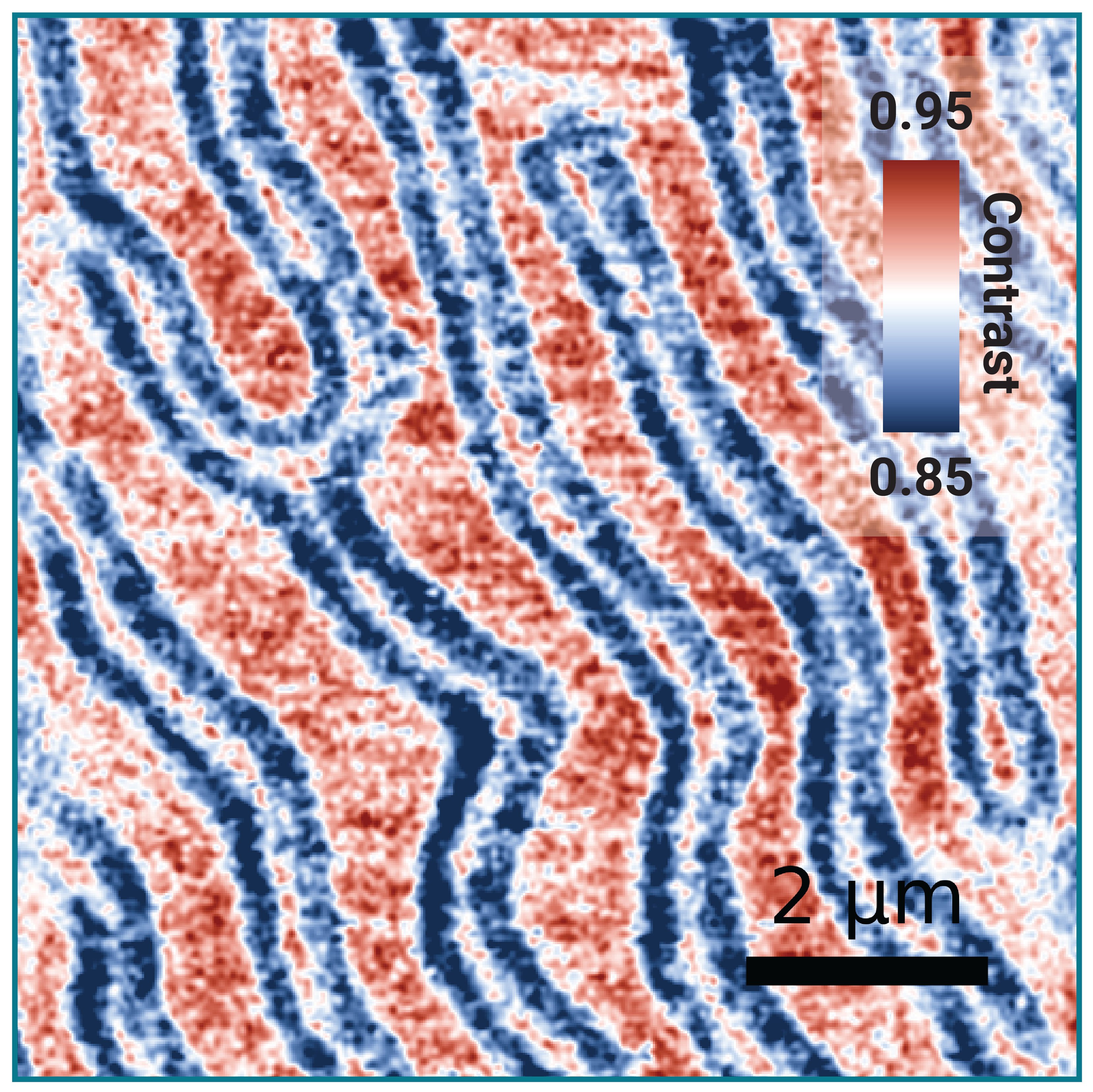 By measuring the NV coherence time during a scan, the QSM directly images the spatial distribution of magnetic noise from features such as domain walls. The image here maps the T₁ coherence time across a Bi:YIG sample surface, where domain boundaries appear as regions of elevated noise and distinct measurement contrast.