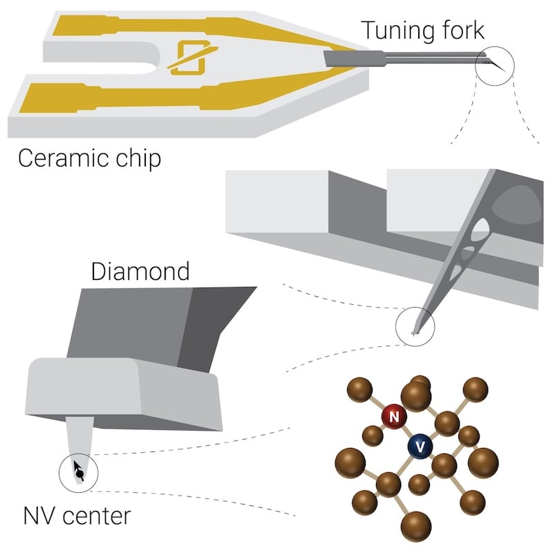 The Quantum Scanning Tip (QST) is a fully integrated, plug-and-play sensor chip built around a single nitrogen-vacancy (NV) center in diamond. A single NV sits at the apex of a diamond tip, just ~10 nm from the surface, mounted on a tuning fork for AFM-compatible force feedback, and assembled on a ceramic chip carrier for easy handling. Drop it into your setup and start measuring.