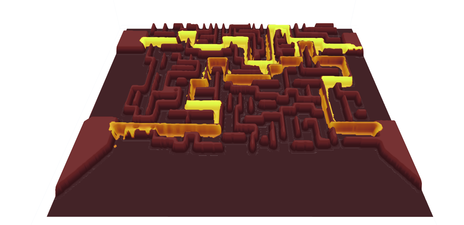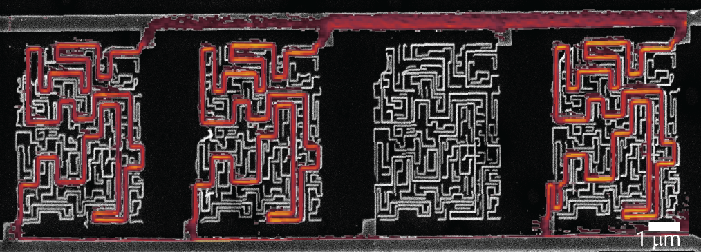 Overlay of SEM image and current density on a set of four identical “maze” structures. Current paths and current densities are clearly discernible. The fourth structure from the left shows a different current flow due to floating lines at the bottom left of the maze. The third structure from the left is defective and does not carry any current, the likely defect is in the top left corner.