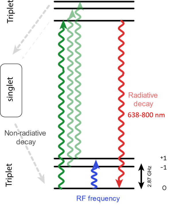 The nitrogen vacancy center can be thought of as a two level system, with an energy spacing in the microwave range. In addition, it will emit red light when excited with green light. State readout is based on the fact that the excited state couples to a "dark state", reducing the fluorescence rate compared to the ground state.