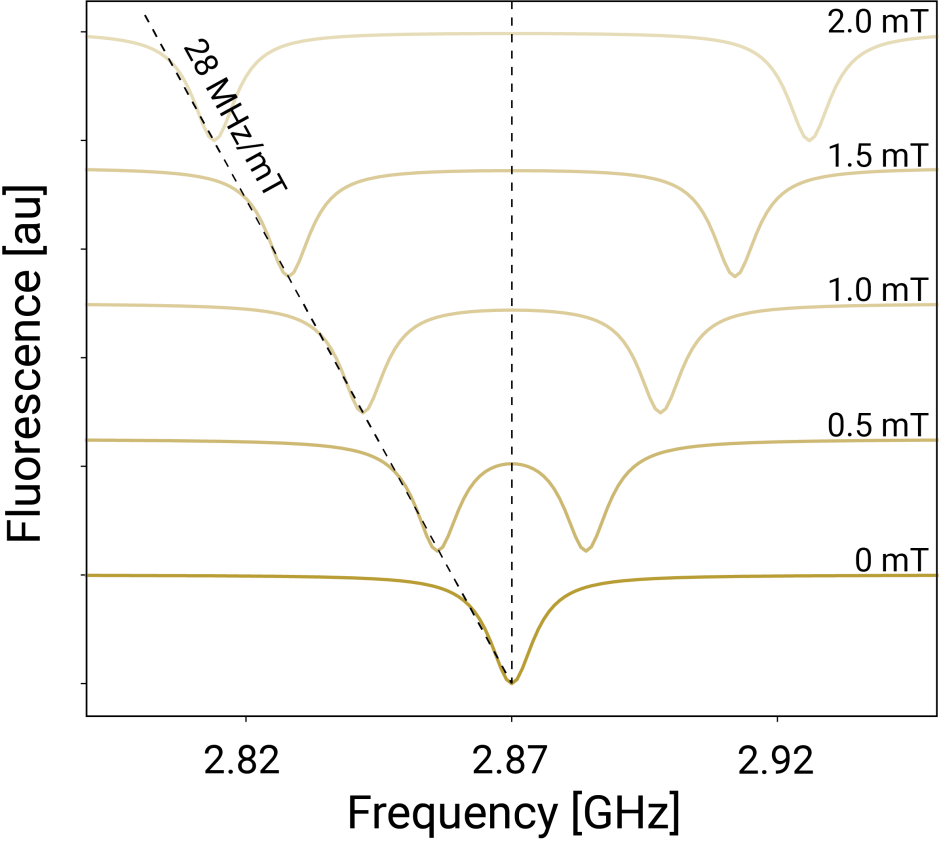 In a simple picture, the NV has a magnetic orientation which we can flip using a specific microwave frequency. If we manage to flip it, the fluorescence rate is reduced. The amount of energy needed to flip the spin (frequency of the microwave) depends on the external magnetic field and its orientation. For increasing field we need more energy to flip the parallel orientation and less to flip the antiparallel one. The frequency difference between these two cases only depends on the magnetic field and the gyromagnetic ratio, which is a natural constant, creating a sensor that does not need to be calibrated.