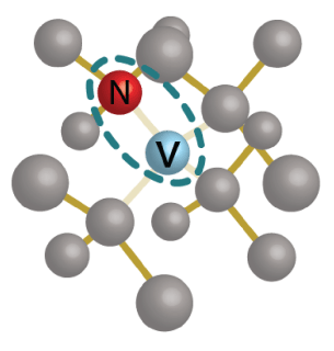 A single defect, also known as color center, in diamond is at the heart of our technology. A Nitrogen Vacancy center is created by removing two adjacent carbon atoms from the crystal lattice and placing one nitrogen at one of the sites. This "artificial atom" has several unique properties that make it interesting for a wide range of applications: