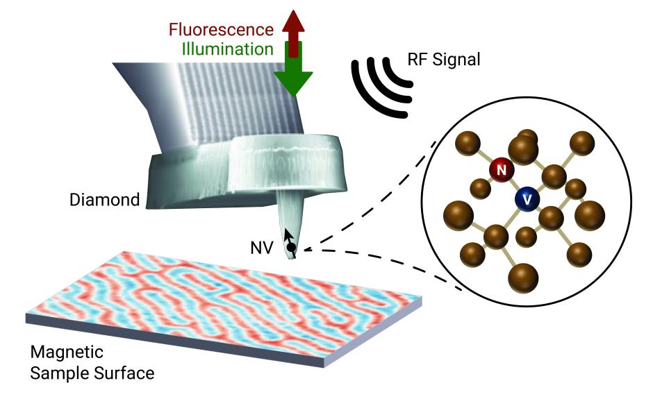 We fabricate scanning probes where the NV center is located at the apex and ~10 nm below the surface. Using atomic force microscopy (AFM) feedback techniques, we then scan the NV over the surface of interest at a height of 20–50 nm. The result is a quantitative map of the surface magnetic field with high sensitivity and resolution.
